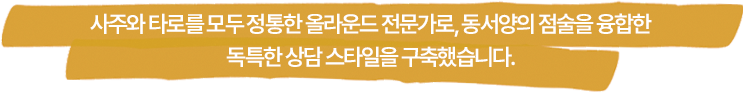 사주와 타로를 결합한 통합 상담으로 더욱 정확하고 깊이 있는 해석을 제공합니다. 동양과 서양의 점술이 만나 보다 완전한 그림을 그려드리며, 개인의 잠재력을 최대한 발휘할 수 있는 방법을 제시합니다.